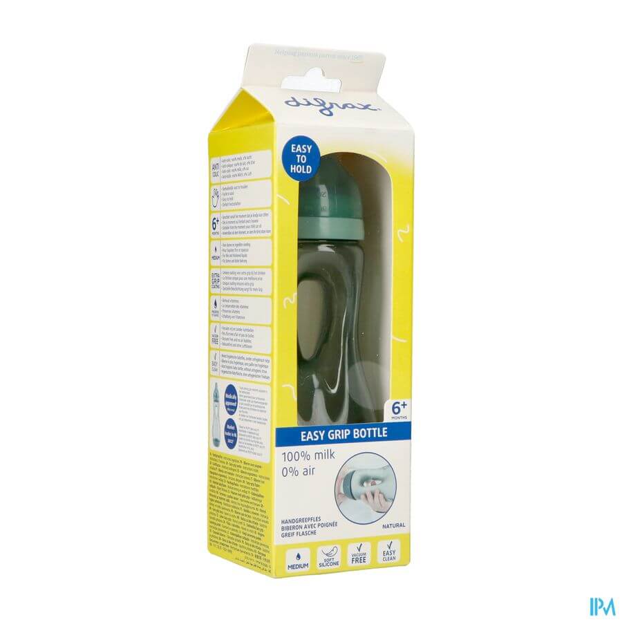 Au fond de la bouteille à poignée se trouve une valve anti-colique unique. Cela empêche la succion par le vide et réduit le risque de rots, de régurgitations et de coliques. La tétine du biberon a une finition douce. Le fond amovible rend le biberon facile à nettoyer. Développé par l'équipe médicale de Difrax.